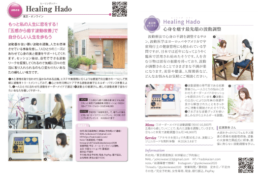 メディア掲載 ポスト シェア はてブ 送る Pocket Pin itHealing hadoは、信頼ある雑誌にてご紹介いただきました。美人百花2025年5月号掲載 「五感から癒やす波動改善」として、自分らしい人生を歩むための サロンとして掲載。波動調整や自宅で取り入れられるセルフケアに ついても紹介されています。 アネモネ 2025年6月号掲載 「心身を癒やす最先端の波動調整」として取り上げられました。 波動療法による不調改善やエネルギーバランスの調整について 美容・健康・人間関係など幅広くサポートできる専門サロンとして 紹介されています。
